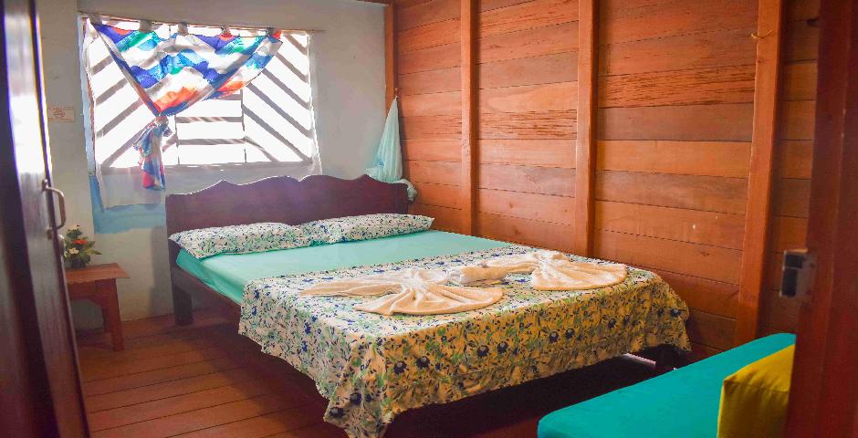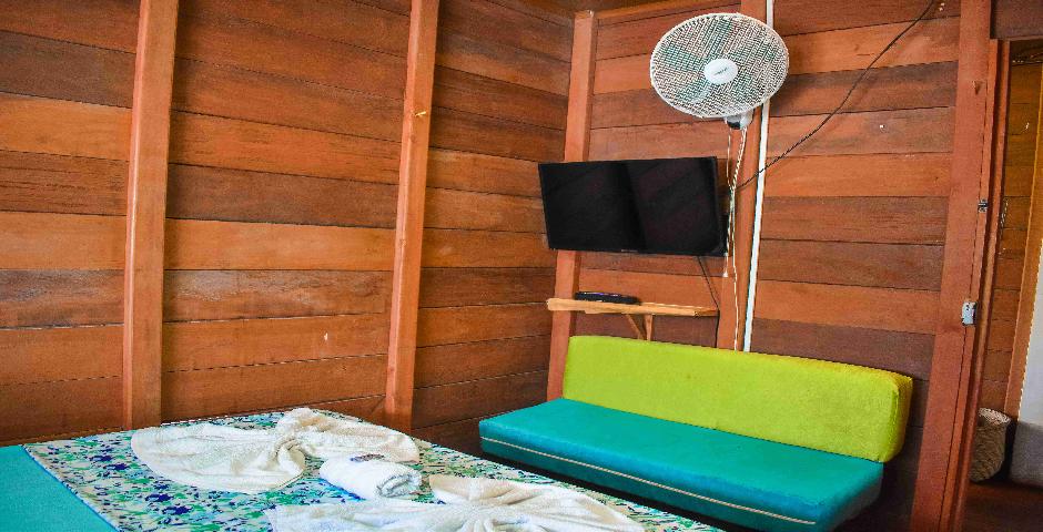 Acogedora habitación construida en madera típica de la región, con cama doble, ventilador de pared, televisor, sofá auxiliar y baño privado con ducha. Decorada con textiles coloridos y detalles florales, ofrece un ambiente cálido, sencillo y confortable para descansar después de una jornada de aventuras en el Pacífico. Ideal para reconectarse con la tranquilidad y el encanto natural de Nuquí.